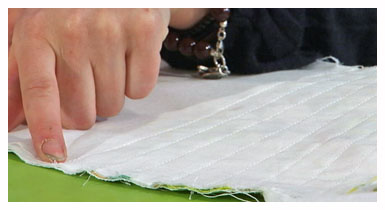 Niina asetti miehustan leikatut kappaleet päällekkäin keskietukappaleen päälle ja ompeli 1-1,5 cm välein suoran tikin pystysuuntaan. Sitten Niina leikkasi tikkausten välistä kaikki kerrokset auki alinta kangasta lukuun ottamatta. Samalla tavoin Niina ompeli ja leikkeli helman kellokappaleen.