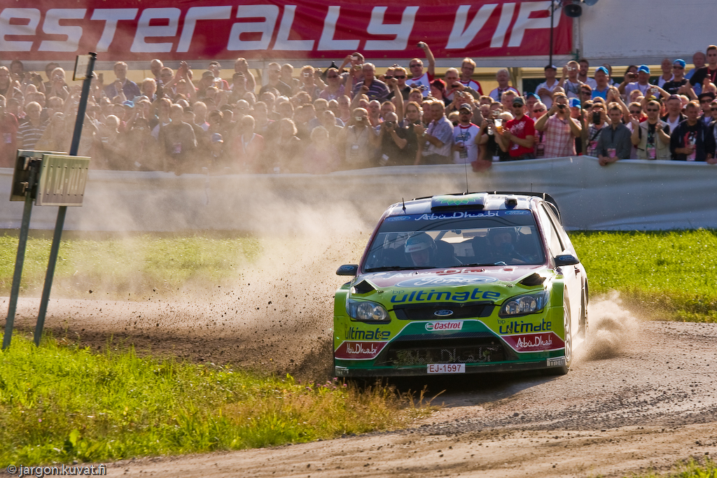 Sää suosii ja rallikansa kannustaa johdossa olevaa Mikko Hirvosta lauantain viimeisellä erikoiskokeella.
