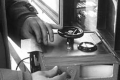 Kioskilla asioiva mies kanniskelee hankalan shekkivihon sijasta puolikiloista rahantekokonetta. Asiakas painaa seteleitä maksuksi ostoksistaan.