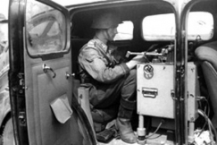 Kuva: Aunuksen radion virkailija soittaa levyä lähetysautossa. (1940-luku) Eino Nurmi.
