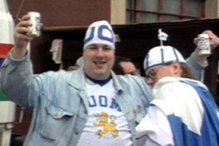 Kuva: Suomalaisia kannattajia jääkiekon MM-kisoissa Prahassa. (1992) YLE kuvanauha.