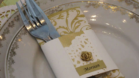 Taitettavat paikkakortit toistavat pöydän koristeluteemaa ruusuin ja pitsein.