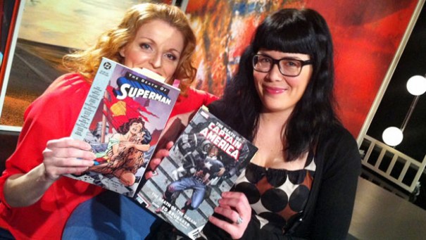 Toimittaja Marjo Harjun (vas.) vieraana on sarjakuvien supersankareista väitellyt tutkija Mervi Miettinen.