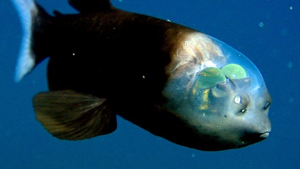 Syvissä vesissä elävällä tummakiikarikalalla (Macropinna microstoma) on läpinäkyvä pää.