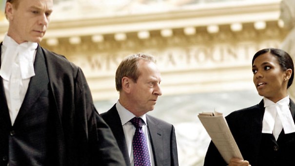 Pääsyyttäjä James Steel (Ben Daniels, vas.), asianajajajien esimies George Castle (Bill Paterson) ja asianajaja Alesha Phillips (Freema Agyeman).