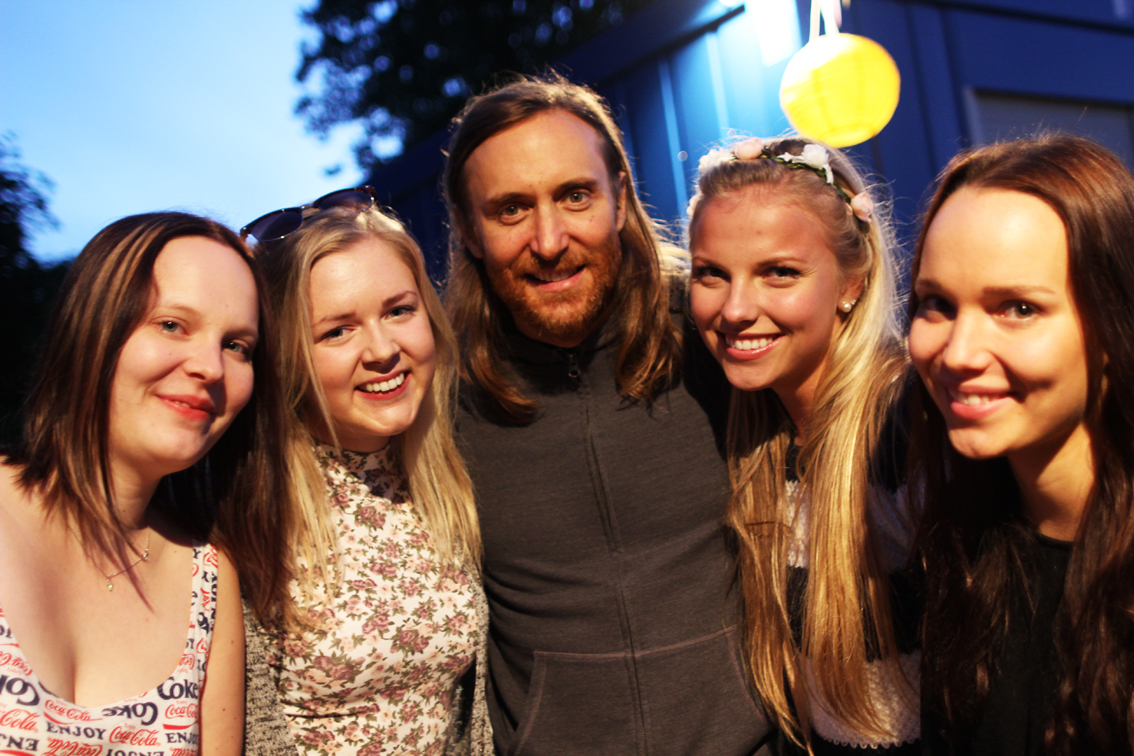 Tyttöjen pohtiessa kysymyksiään backstagelle kurvasi musta Mersu, jonka uumenista syöksyi esiin puhelimeen puhuva Guetta. Pikaisen takahuonevisiitin jälkeen ranskalais-DJ tuli tervehtimään tyttöjä iso hymy naamallaan.